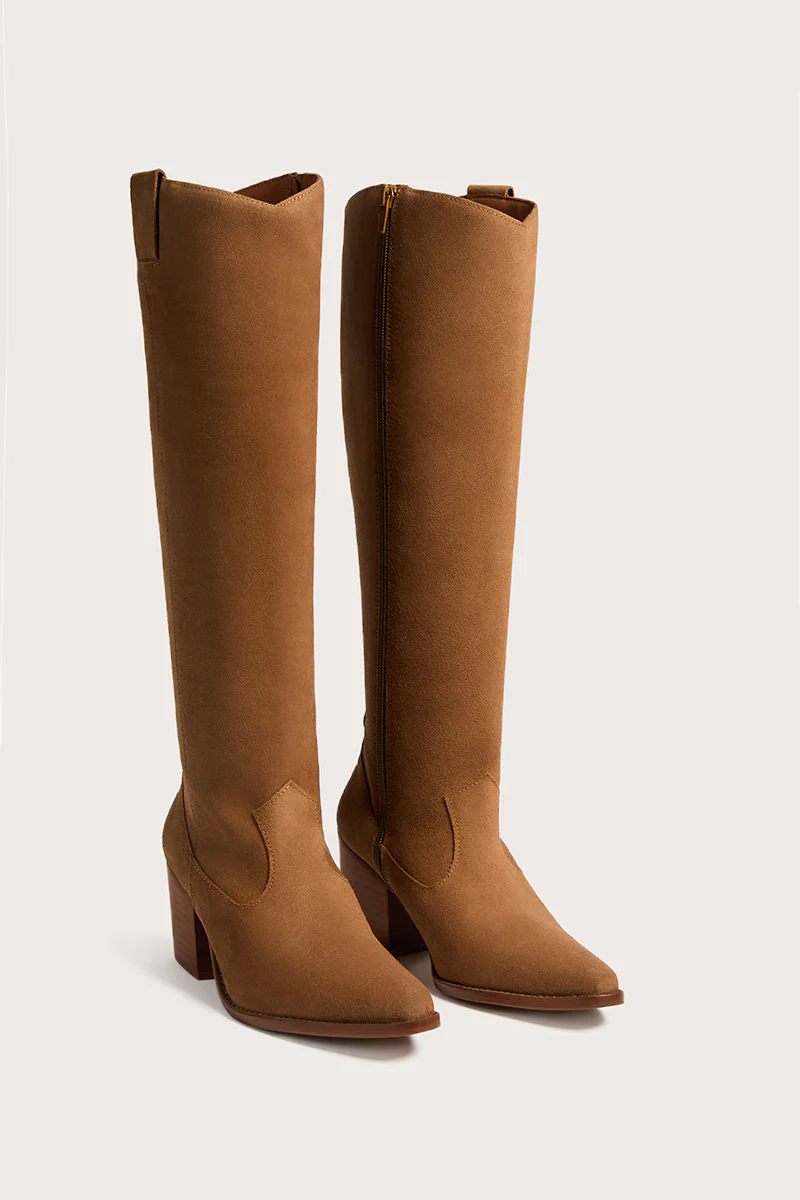 Bota alta de piel estilo campero con acabado en punta. Tacón angulado y cierre lateral mediante cremallera.