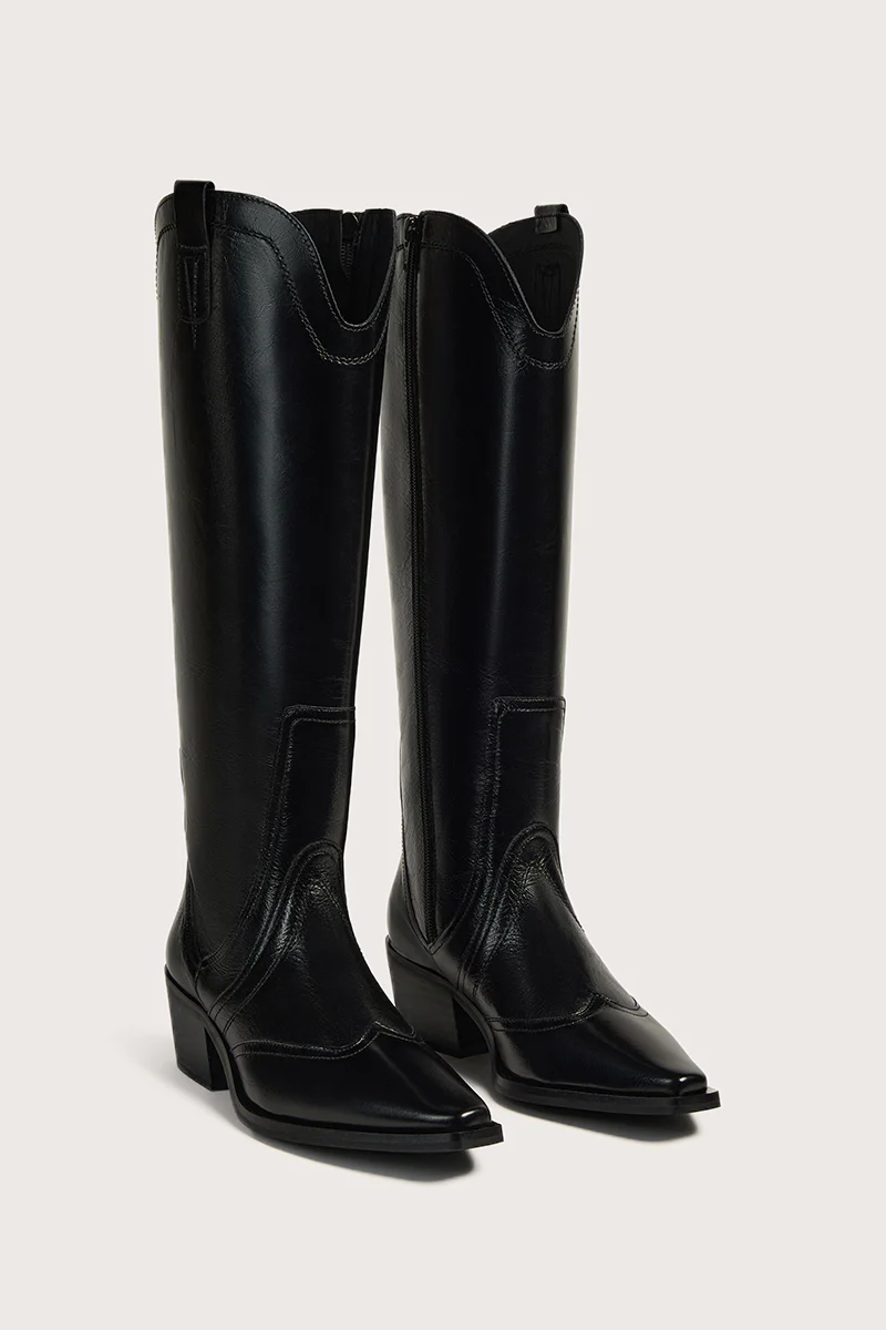 Bota de piel estilo campera, de caña alta con puntera cowboy con terminación recta. Apliques de piel bordados. Cierre lateral mediante cremallera.