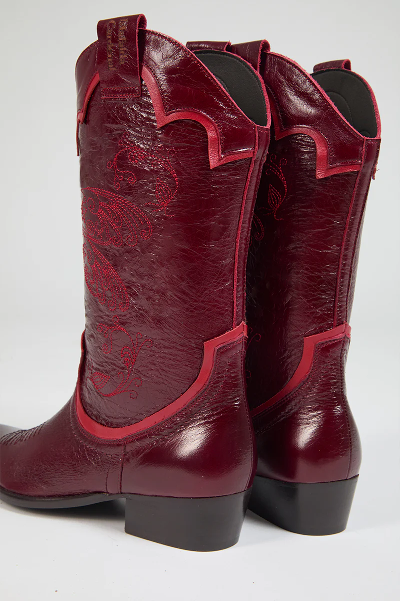 Bota cowboy hecha especialmente para el tour "Mis notas de voz" de Mafalda Cardenal en su gira por Latinoamérica y España. Un diseño clásico tejano con bordados de la libélula, sello de identidad del último disco de la cantante.