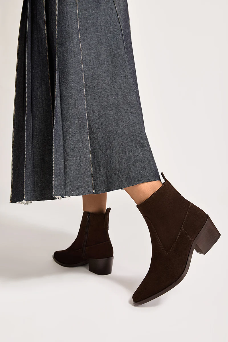 Botín de piel estilo cowboy con terminación en punta. Cierre mediante cremallera lateral.