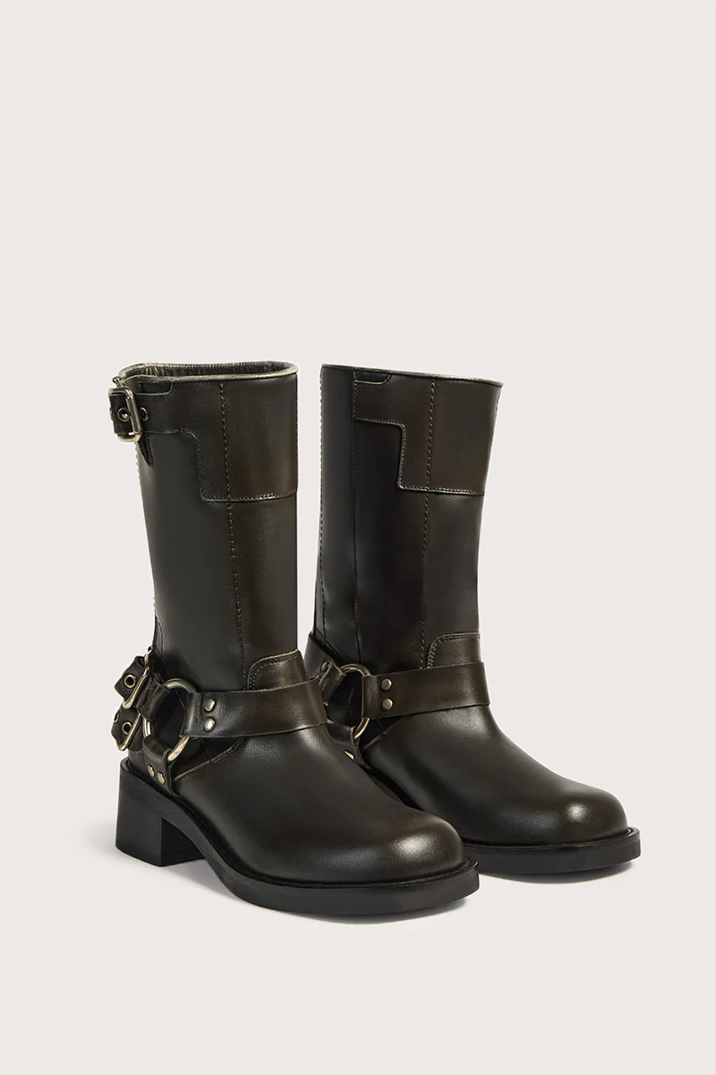 Botas estilo biker de piel estilo desgastado. Punta redondeada y hebillas decorativas.