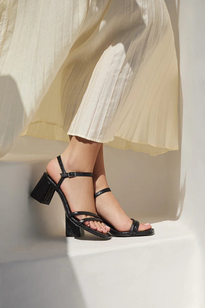 Sandalia de tacón forrada en 100% piel con hebilla ajustable al tobillo.