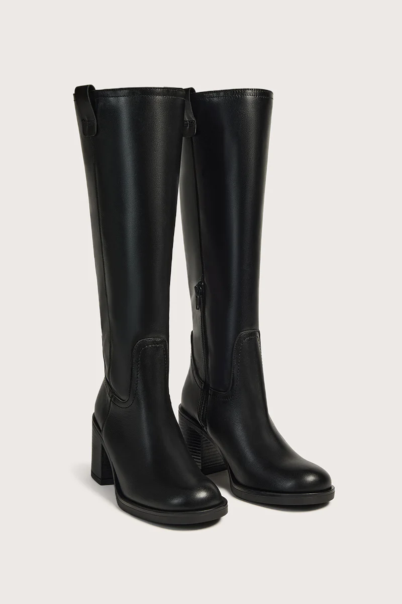 Botas altas estilo biker de piel efecto desgastado con punta redondeada y tacón ancho de altura. Diseñado y fabricado en España artesanalmente.