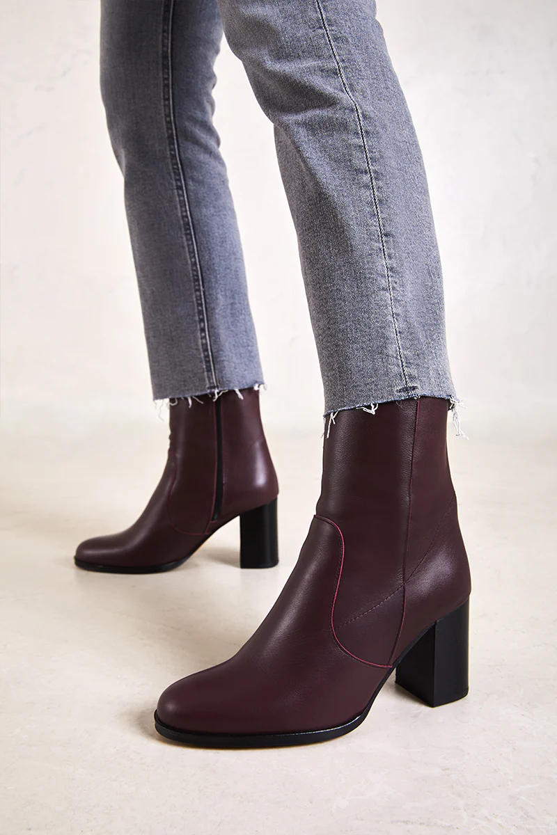 Botín de tacón con punta redondeada y caña firme. Cierre con cremallera lateral.